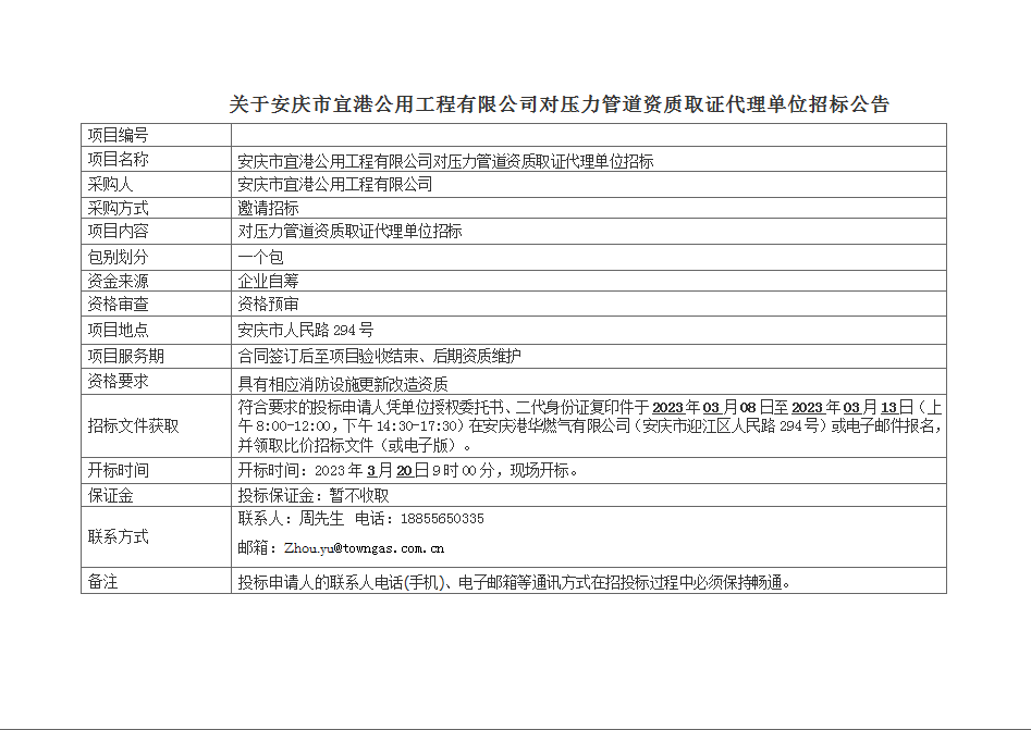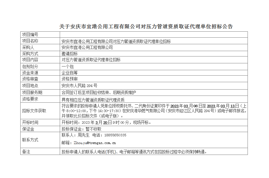 關(guān)于安慶市宜港公用工程有限公司對壓力管道資質(zhì)取證代理單位招標(biāo)公告