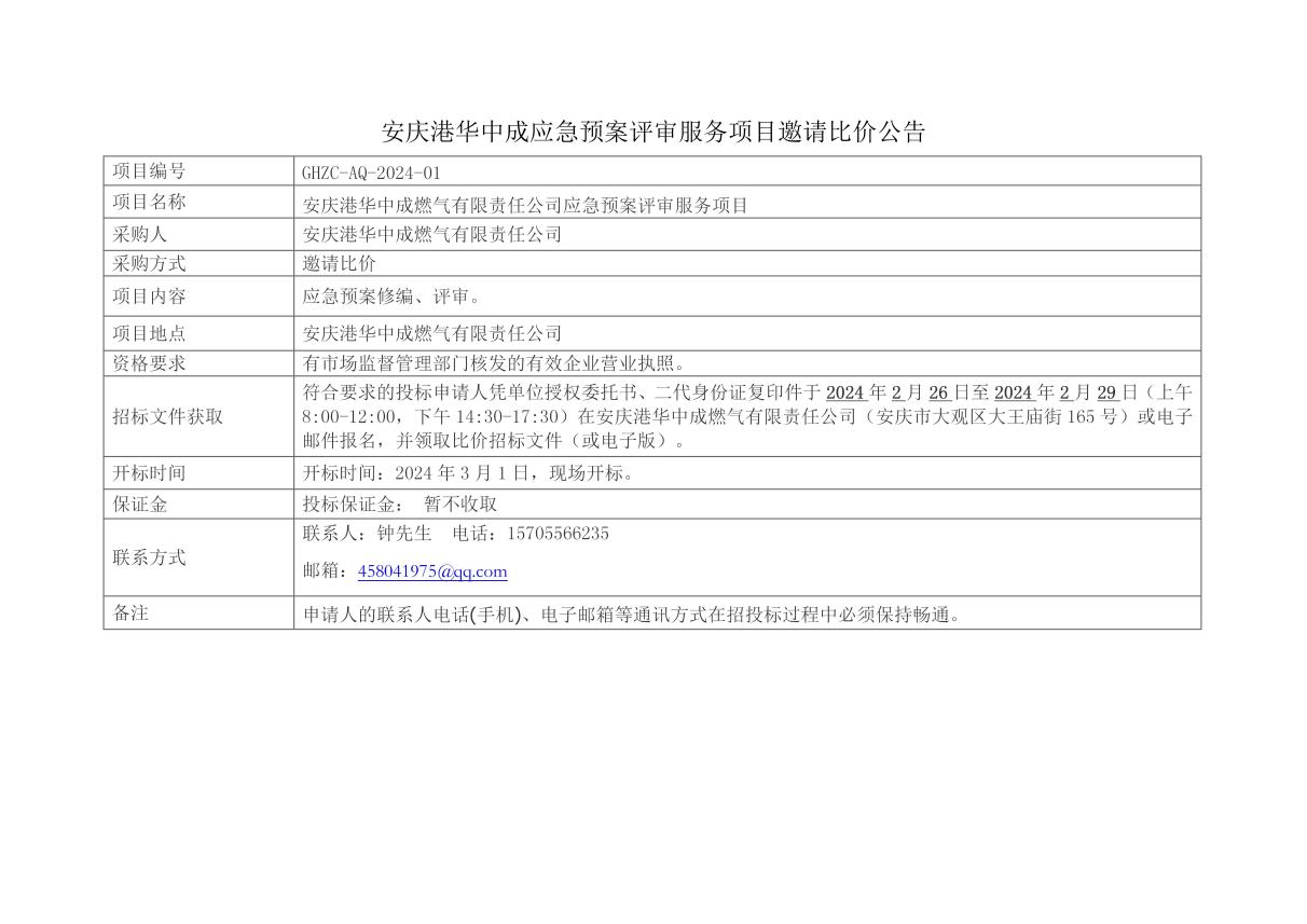 安慶港華中成應(yīng)急預(yù)案評(píng)審服務(wù)項(xiàng)目邀請(qǐng)比價(jià)公告