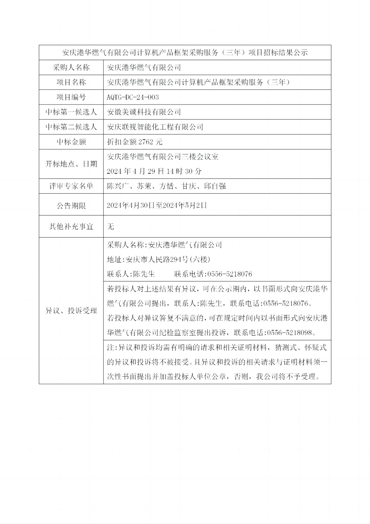 安慶港華燃?xì)庥邢薰居?jì)算機(jī)產(chǎn)品框架采購(gòu)服務(wù)(三年)項(xiàng)目招標(biāo)結(jié)果公示