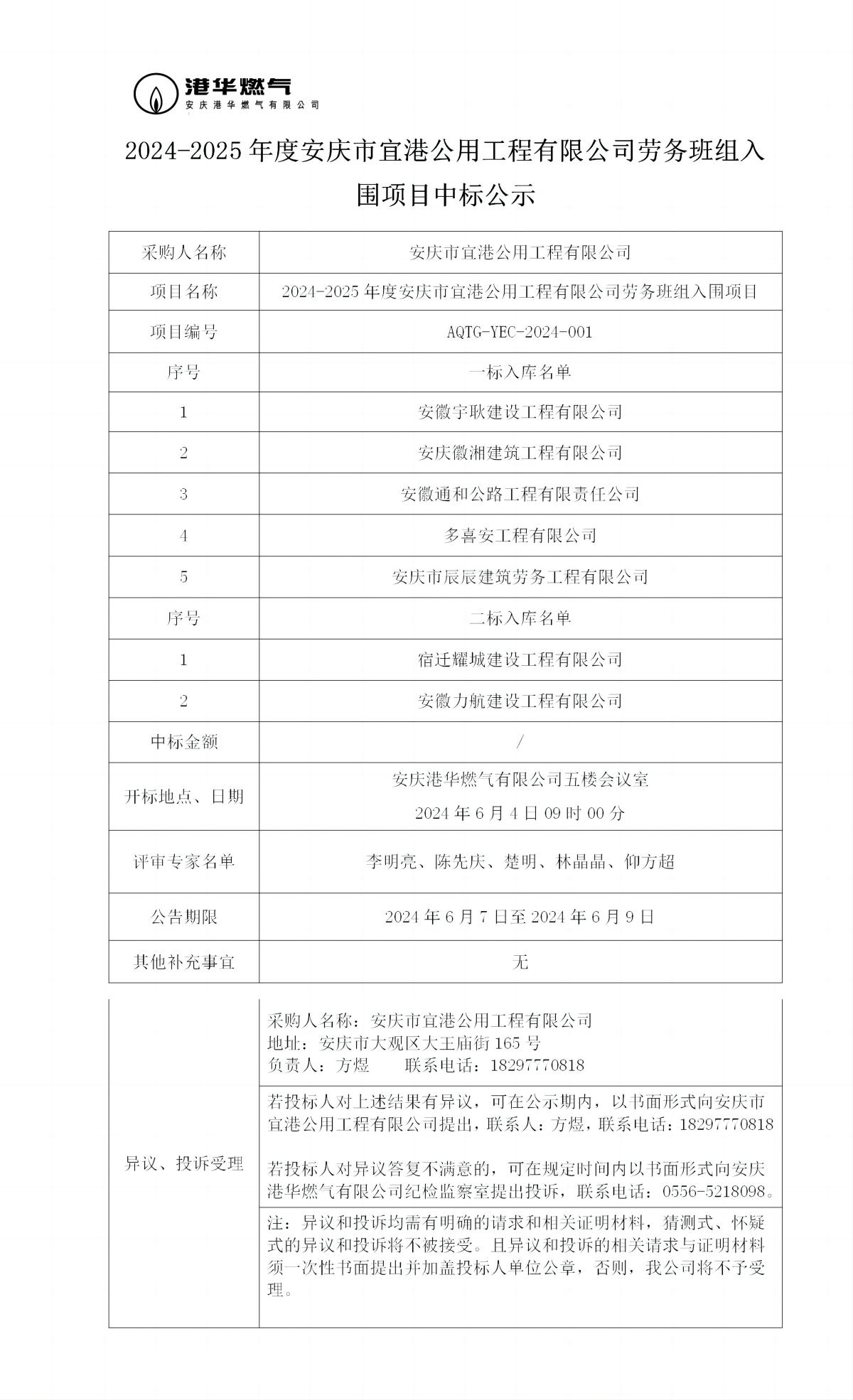 2024-2025年度安慶市宜港公用工程有限公司勞務(wù)班組入圍項(xiàng)目中標(biāo)公示