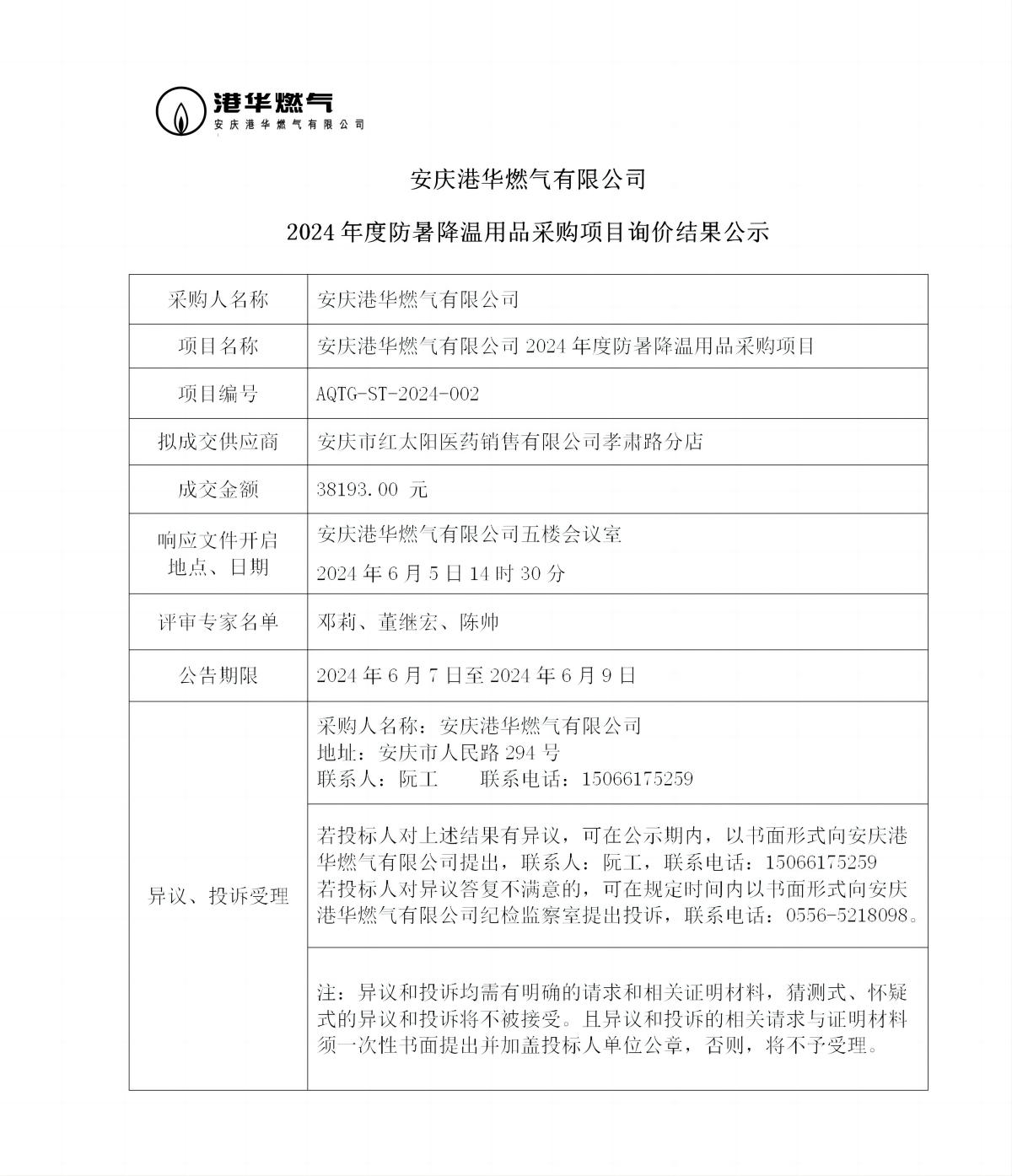 安慶港華燃?xì)庥邢薰?024年度防暑降溫用品采購項(xiàng)目詢價結(jié)果公示