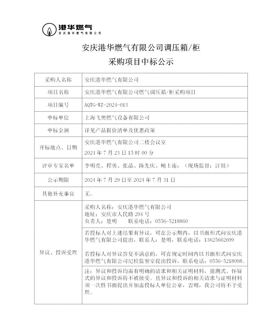 安慶港華燃氣有限公司調壓箱/柜采購項目中標公示