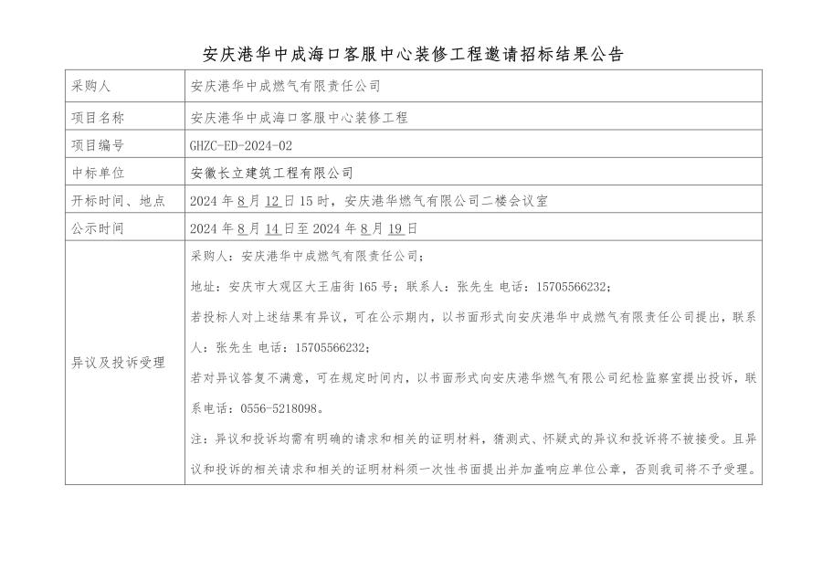 安慶港華中成海口客服中心裝修工程邀請招標(biāo)結(jié)果公告