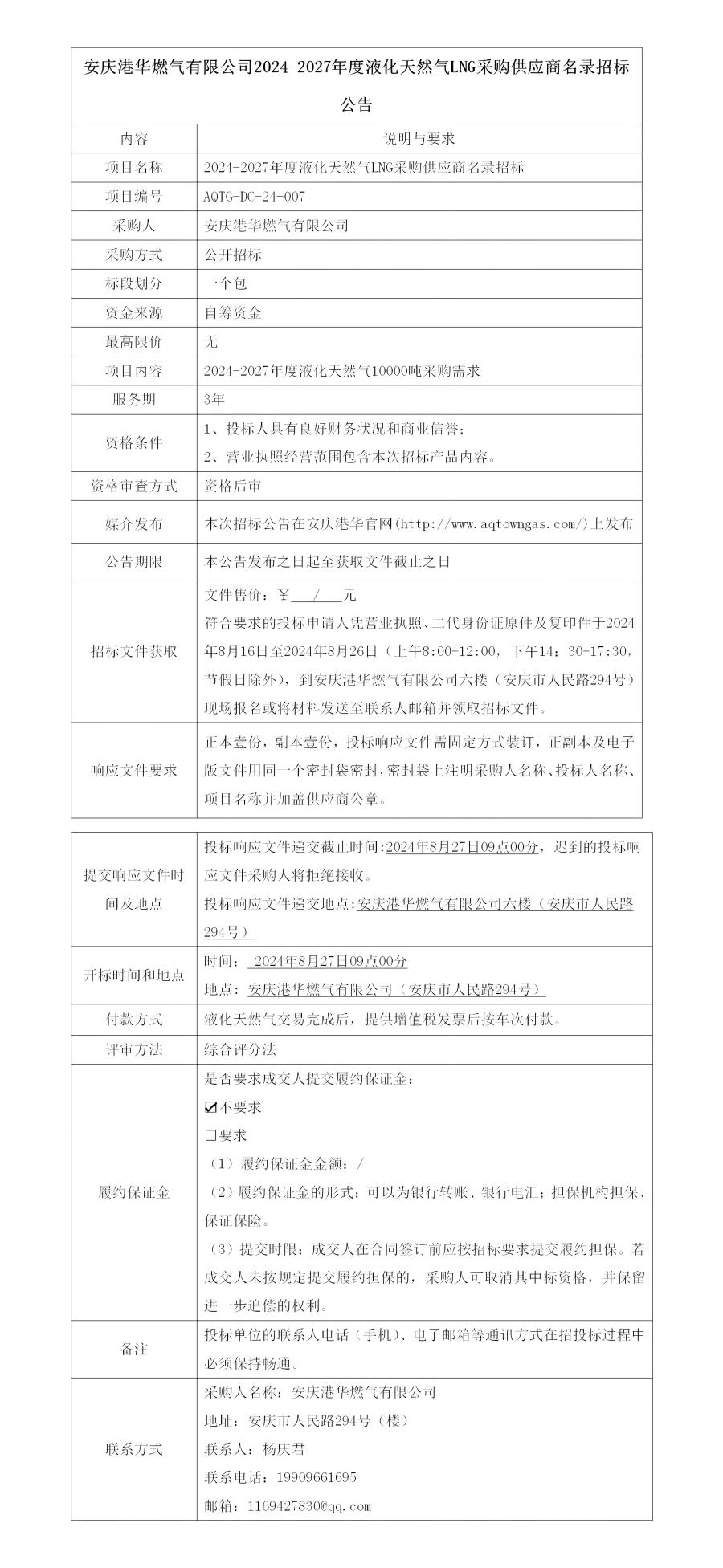 安慶港華燃氣有限公司2024-2027年度液化天然氣LNG采購供應商名錄招標公告