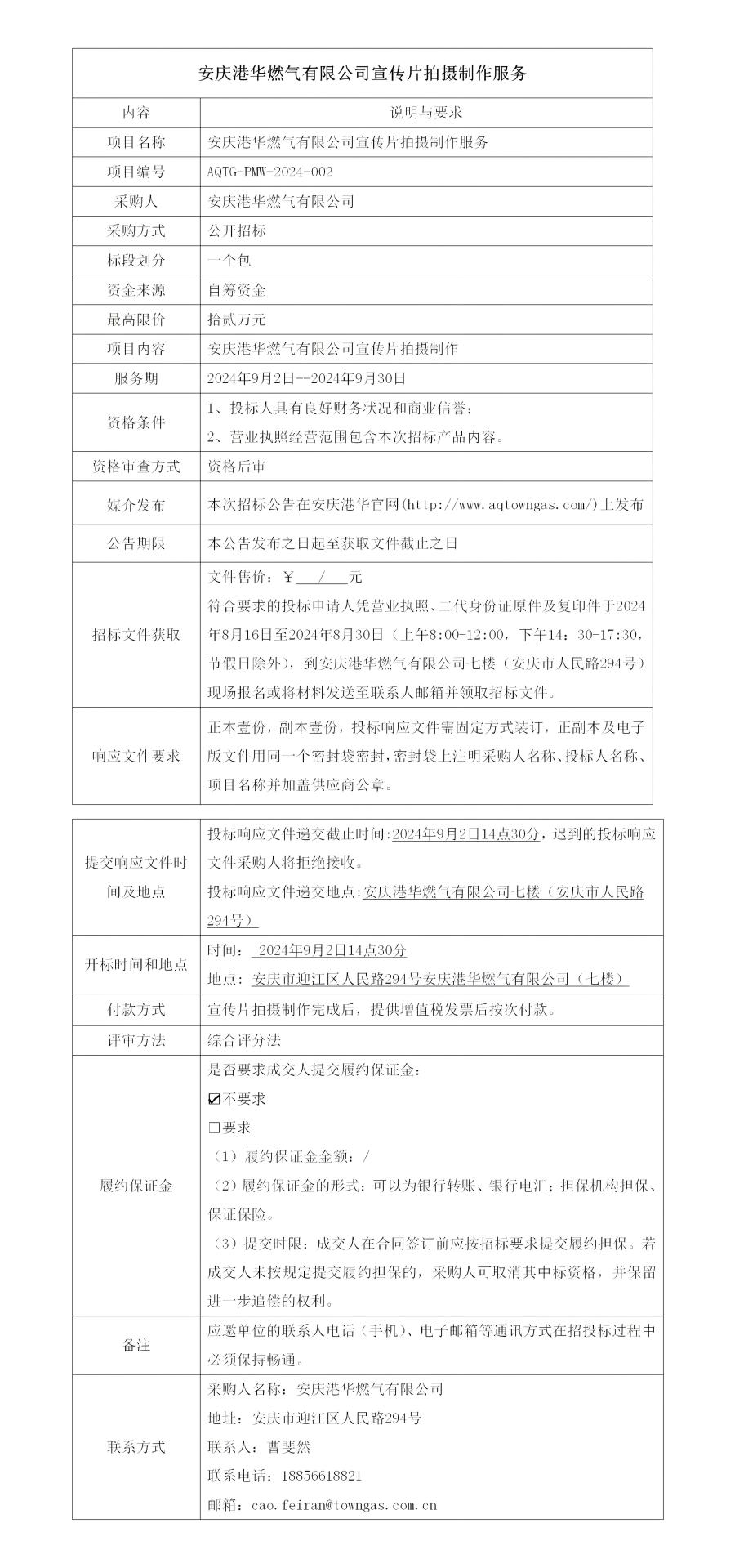 安慶港華燃?xì)庥邢薰拘麄髌臄z制作服務(wù)項目招標(biāo)公告