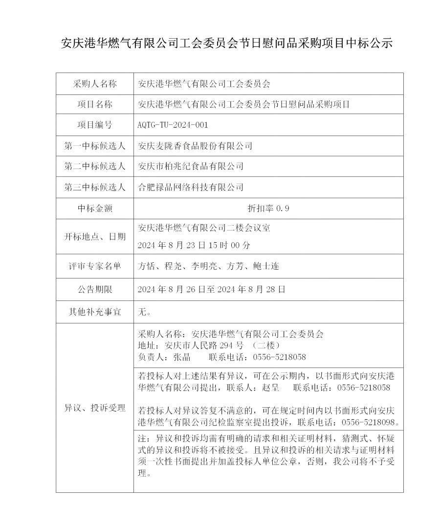 安慶港華燃?xì)庥邢薰竟瘑T會節(jié)日慰問品采購項(xiàng)目中標(biāo)公示