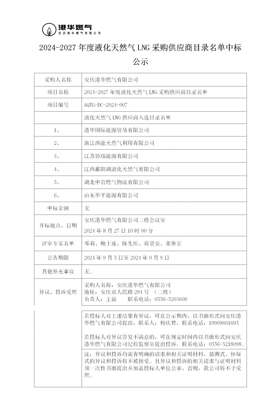 2024-2027年度液化天然氣LNG采購供應商目錄名單中標公示