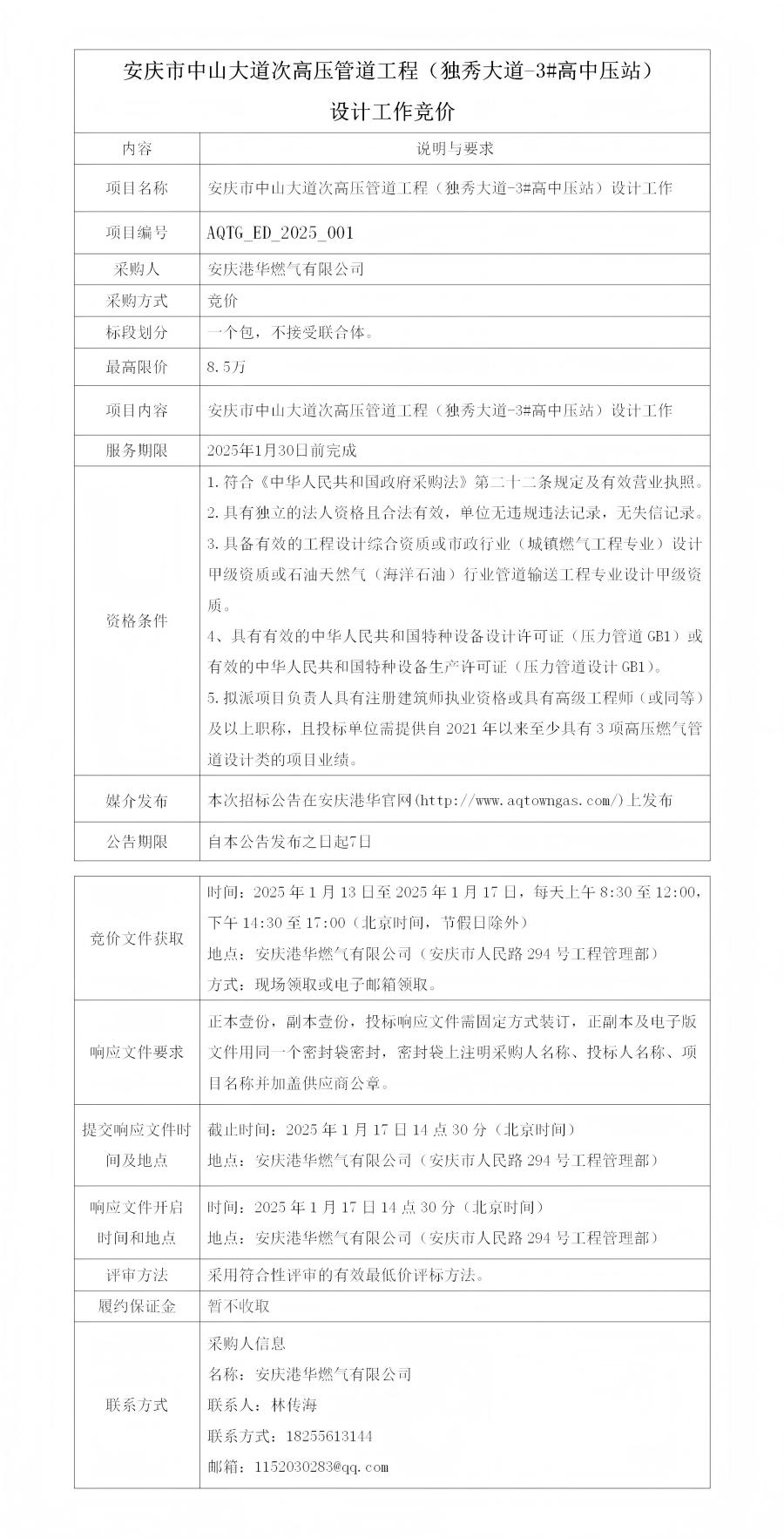 安慶市中山大道次高壓管道工程(獨(dú)秀大道-3#高中壓站)設(shè)計(jì)工作競價(jià)