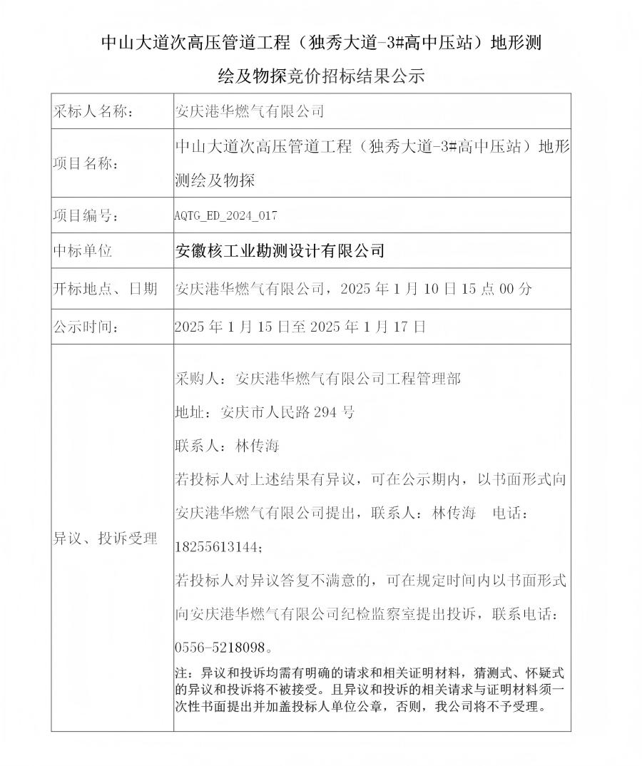中山大道次高壓管道工程(獨秀大道-3#高中壓站)地形測繪及物探競價招標結(jié)果公示