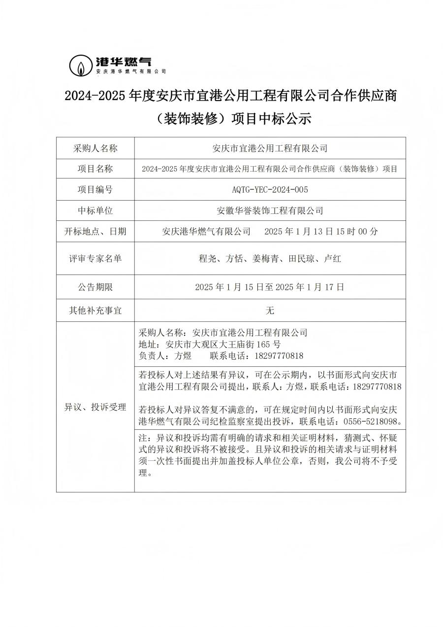 2024-2025 年度安慶市宜港公用工程有限公司合作供應商 (裝飾裝修)項目中標公示