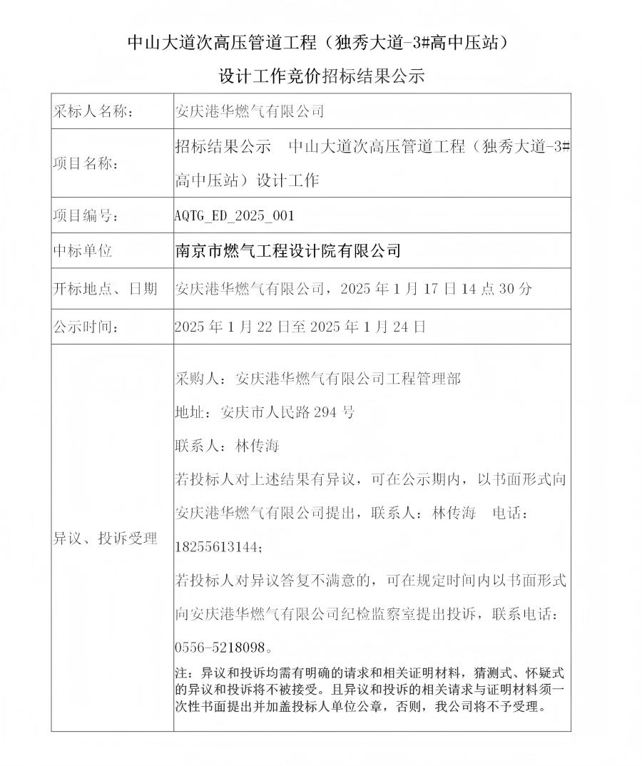 中山大道次高壓管道工程(獨秀大道-3#高中壓站)設計工作競價招標結果公示