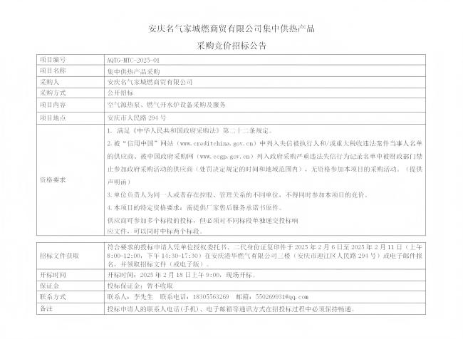 安慶名氣家城燃商貿(mào)有限公司集中供熱產(chǎn)品采購(gòu)競(jìng)價(jià)招標(biāo)公告