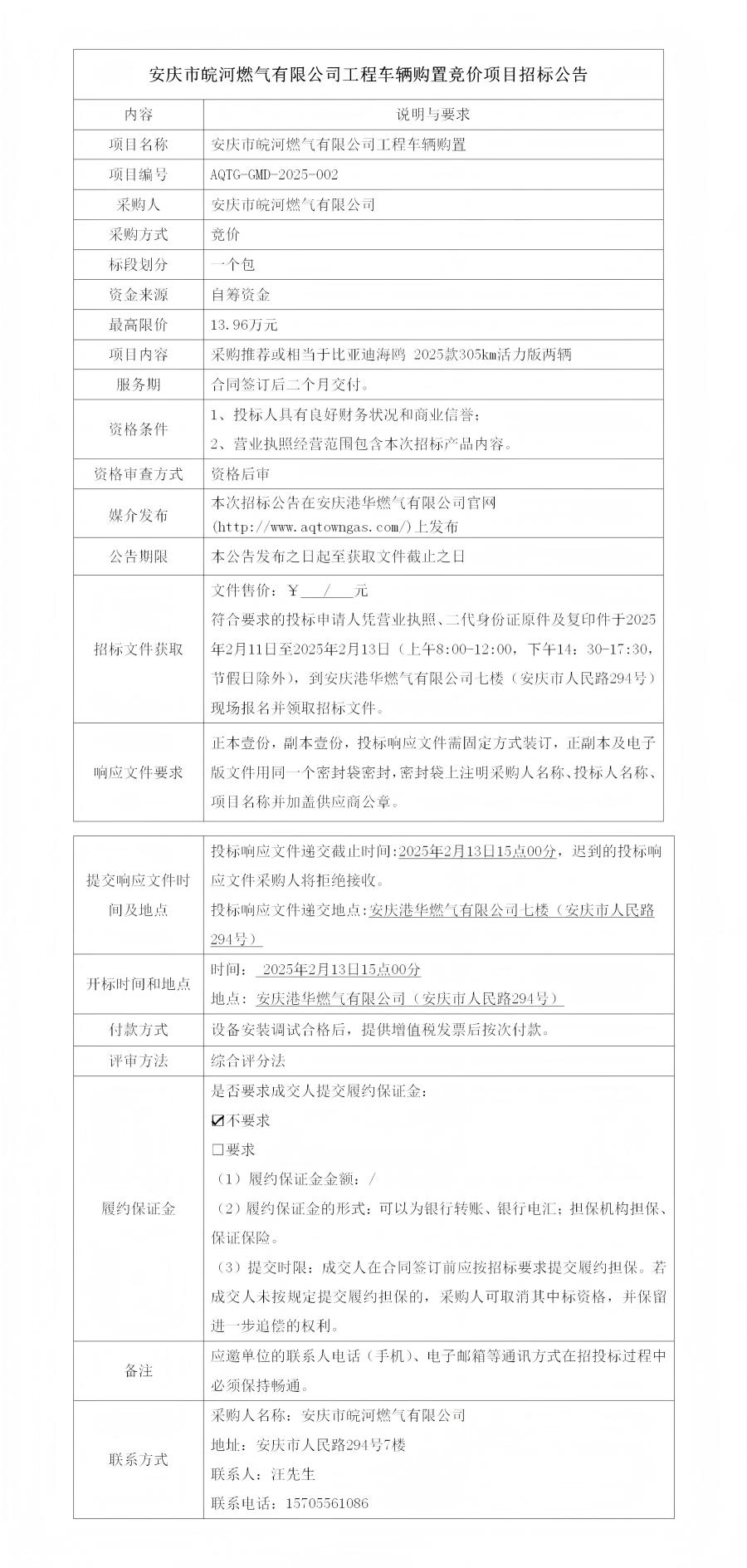 安慶市皖河燃?xì)庥邢薰竟こ誊囕v購置競(jìng)價(jià)項(xiàng)目招標(biāo)公告